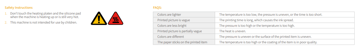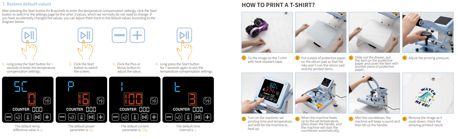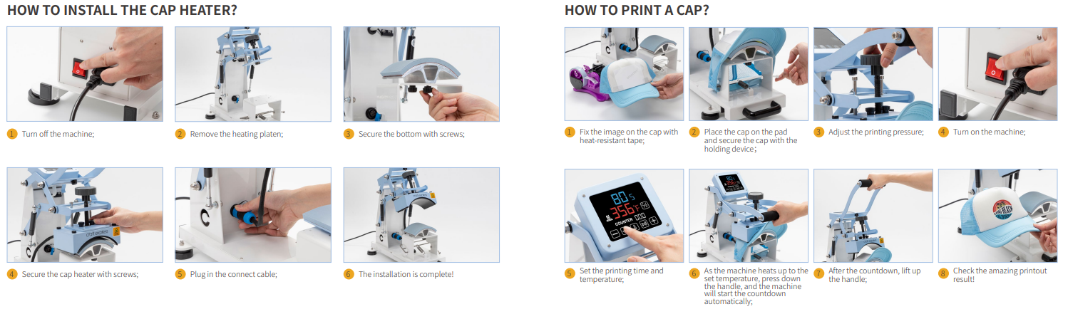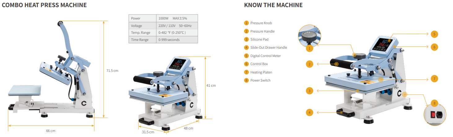 With this Heat Press, you can transfer your own printed images with Heat transfer paper or EasyColor DTV or customize your logo with Heat transfer vinyl onto fabrics, such as T-shirts, sweatshirts, hoodies, trousers, and caps.